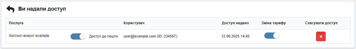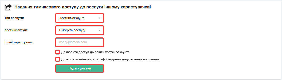 - Виберіть тип послуги та її назву, вкажіть пошту користувача, якому потрібно надати доступ, виберіть налаштування доступу та натисніть «Надати доступ»: