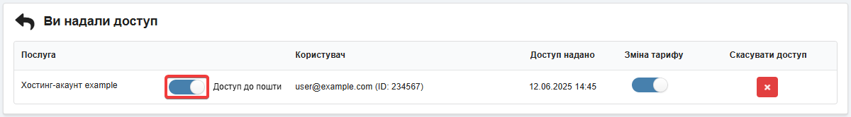Відкрийте розділ «Делегування доступу» і в блоці «Ви надали доступ» увімкніть або вимкніть опцію «Доступ до пошти»: