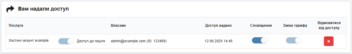 Якщо увімкнено, користувач із делегованим доступом зможе працювати з поштою хостинг-акаунта (бачити список поштових скриньок, керувати їхніми налаштуваннями, видаляти тощо).