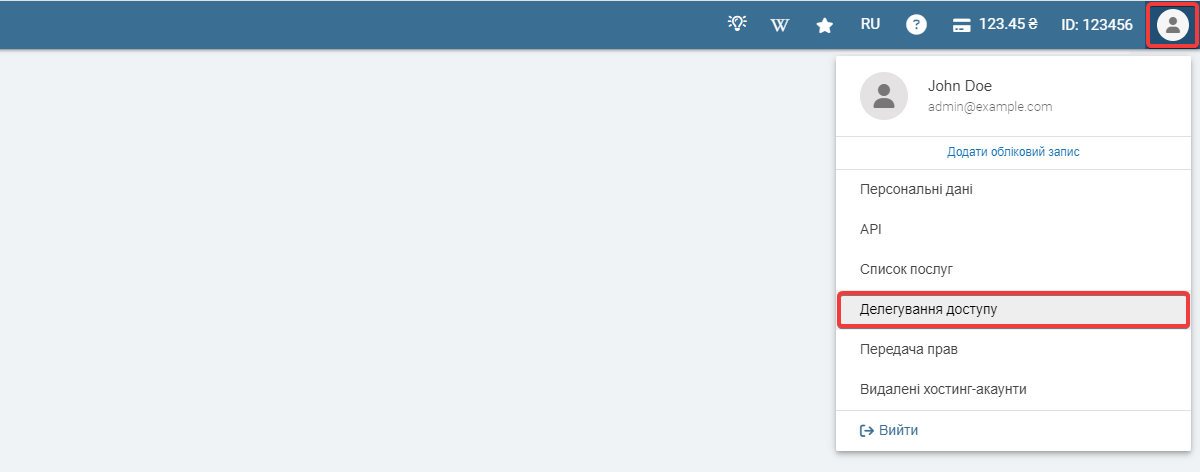 - У меню домену натисніть «Делегувати доступ».
