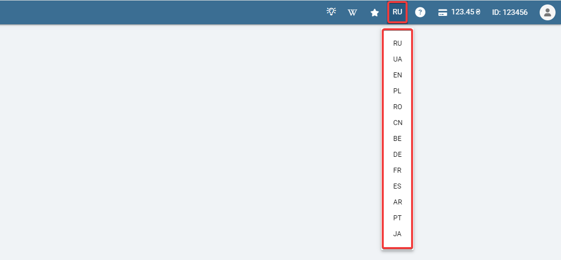 Для зміни мови інтерфейсу використовуйте перемикач у верхній частині панелі керування: