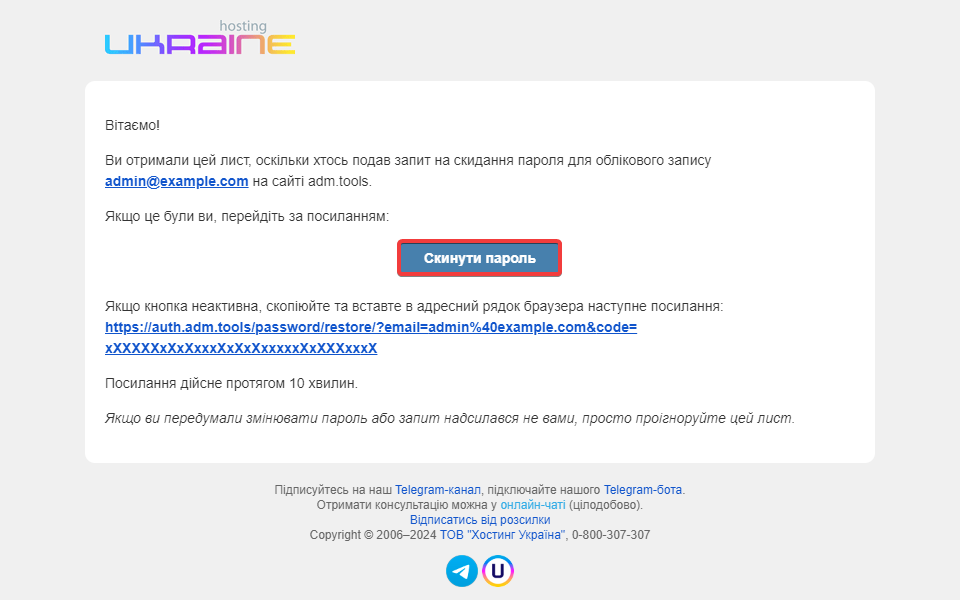- На пошту облікового запису буде надіслано лист із посиланням на форму скидання пароля — дочекайтеся листа та перейдіть за посиланням (дійсне протягом 10 хвилин):