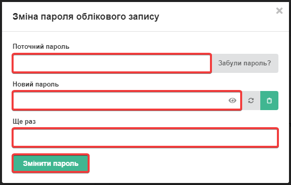 - У вікні, що з'явилося, вкажіть поточний пароль, потім двічі новий пароль і натисніть «Змінити»: