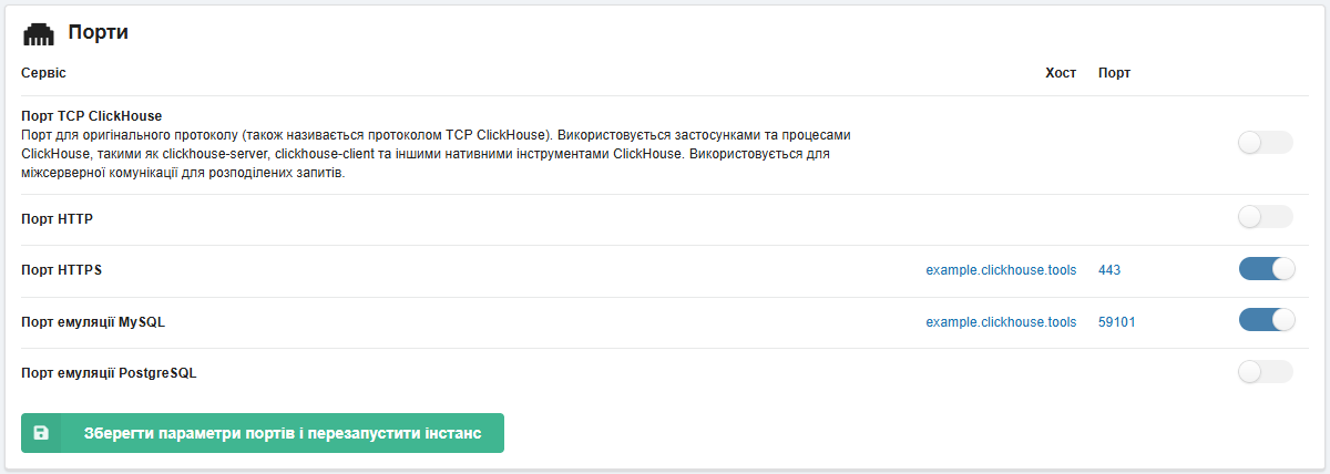 Керування портами інстансу ClickHouse виконується в розділі «ClickHouse» на вкладці «Налаштування»: