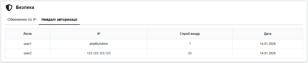 На вкладці відображається журнал невдалих спроб підключення до баз даних (з використанням неправильного логіна або пароля) за останні 3 дні: