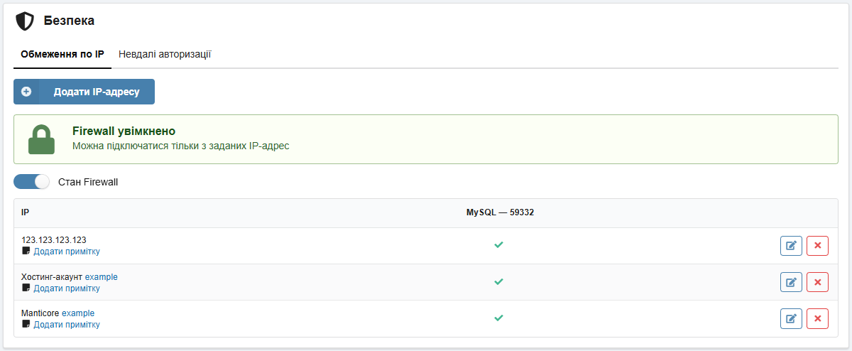 За допомогою кнопки «Додати IP-адресу» можна додавати IP-адреси / хостинг-акаунти / інстанси Manticore Search, які повинні мати доступ до інстансу.