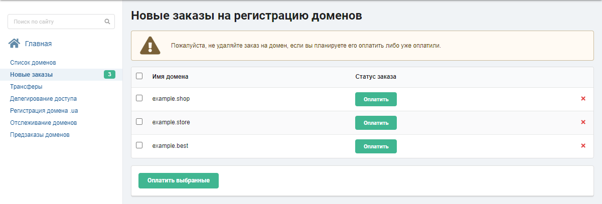 - Якщо потрібно оплатити відразу кілька доменів — виберіть їх і натисніть «Оплатити вибрані».