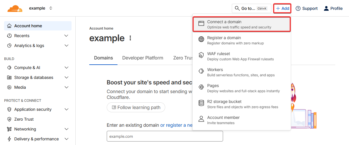 - У панелі керування Cloudflare у правому верхньому куті натисніть «Add» і виберіть «Connect a domain»: