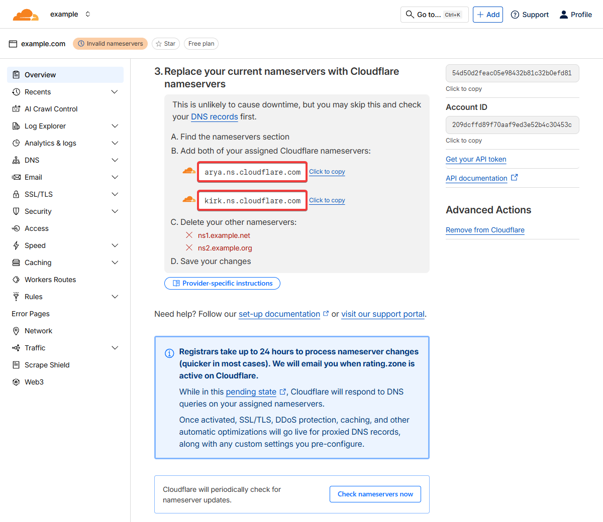 - Дочекайтеся оновлення кешу DNS (зазвичай кілька годин, максимум 24) і натисніть «Check nameservers now» (або просто почекайте, поки Cloudflare сам побачить свої NS).