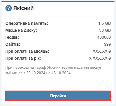 - Зміна тарифу недоступна під час міграції хостинг-акаунта між серверами, наприклад в процесі зміни країни, зміни версії MySQL і т. д. Для зміни тарифу потрібно дочекатися закінчення міграції.