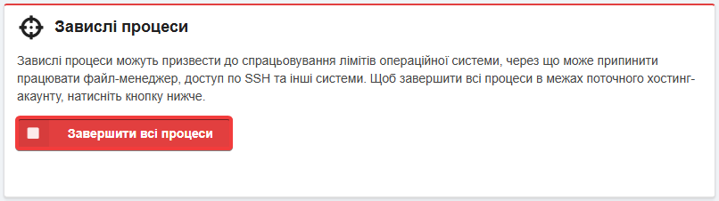 У блоці «Завислі процеси» можна примусово завершити всі процеси хостинг-акаунта кнопкою «Завершити всі процеси»: