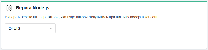 У блоці «Версія Node.js» встановлюється версія Node.js, яка буде використовуватися в консолі (також впливає на версію npm — у кожної версії Node.js своя максимально допустима версія npm):