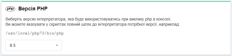 У блоці «Версія PHP» встановлюється версія PHP, яка буде використовуватися в консолі: