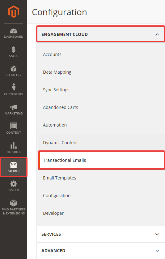 - Відкрийте розділ «Stores → ENGAGEMENT CLOUD → Transactional Emails»: