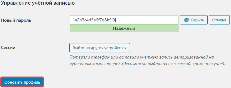 - У полі, що з'явилося, відобразиться новий пароль, який можна залишити або самостійно змінити на більш підходящий, після чого потрібно натиснути «Оновити профіль» для прийняття змін: