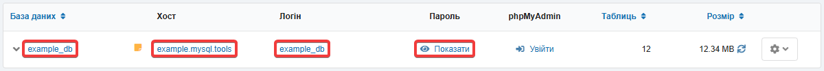 - Пароль (пароль користувача бази даних) — пароль з колонки «Пароль».