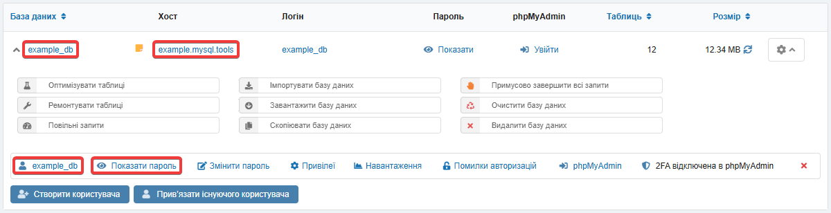 Для підключення до бази даних використовуйте дані з розділу «Бази даних»: