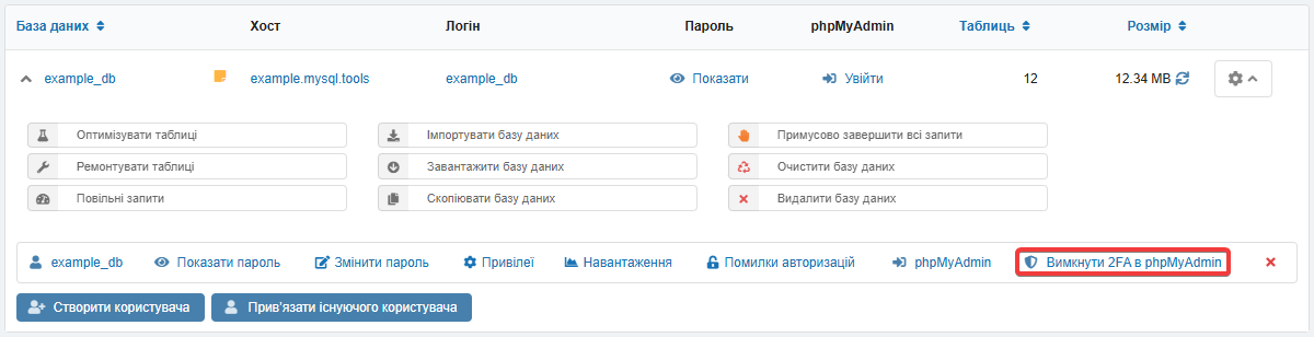 - Видалення користувача бази даних вимикає для нього двоетапну аутентифікацію в phpMyAdmin.