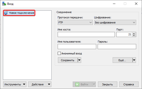 Перед підключенням перевірте налаштування безпеки FTP — у дозволених має бути додана IP-адреса, з якої буде виконуватися підключення, або обмеження доступу мають бути вимкнені.- Натисніть «Нове підключення»: