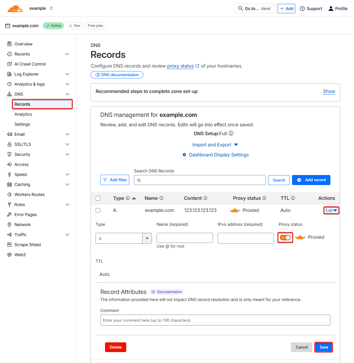 На сторінці вашого домену в розділі «DNS → Records» у рядку з DNS-записом натисніть «Edit», вимкніть перемикач проксі-сервера («Proxied» має змінитися на «DNS only») і збережіть зміни: