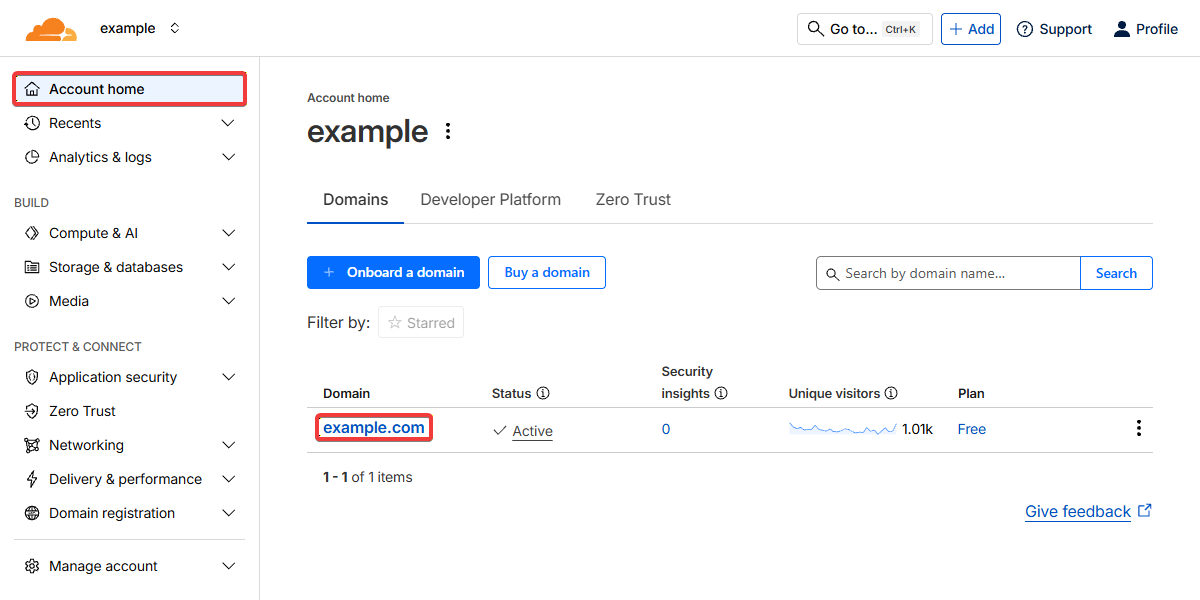 - На головній сторінці панелі керування Cloudflare натисніть на ваш домен: