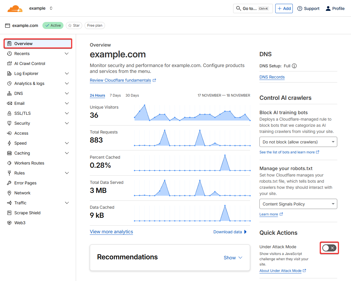 - У розділі «Overview» у правій панелі увімкніть режим «Under Attack Mode»: