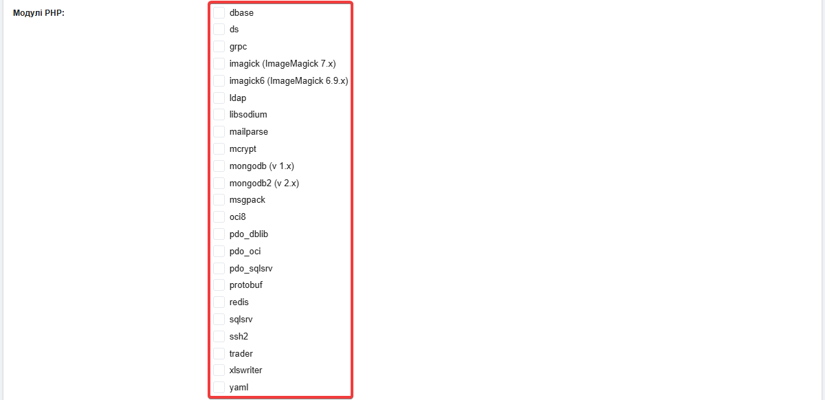 Деякі модулі за замовчуванням вимкнені та вмикаються в розділі «Налаштування PHP» у секції «Модулі PHP»: