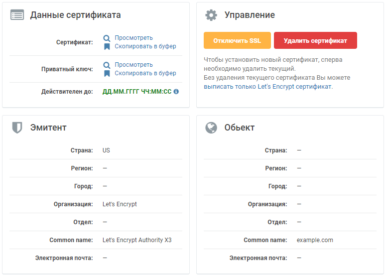 Переглянути інформацію про SSL-сертифікат можна в розділі «Налаштування SSL». При встановленому сертифікаті розділ виглядає так: