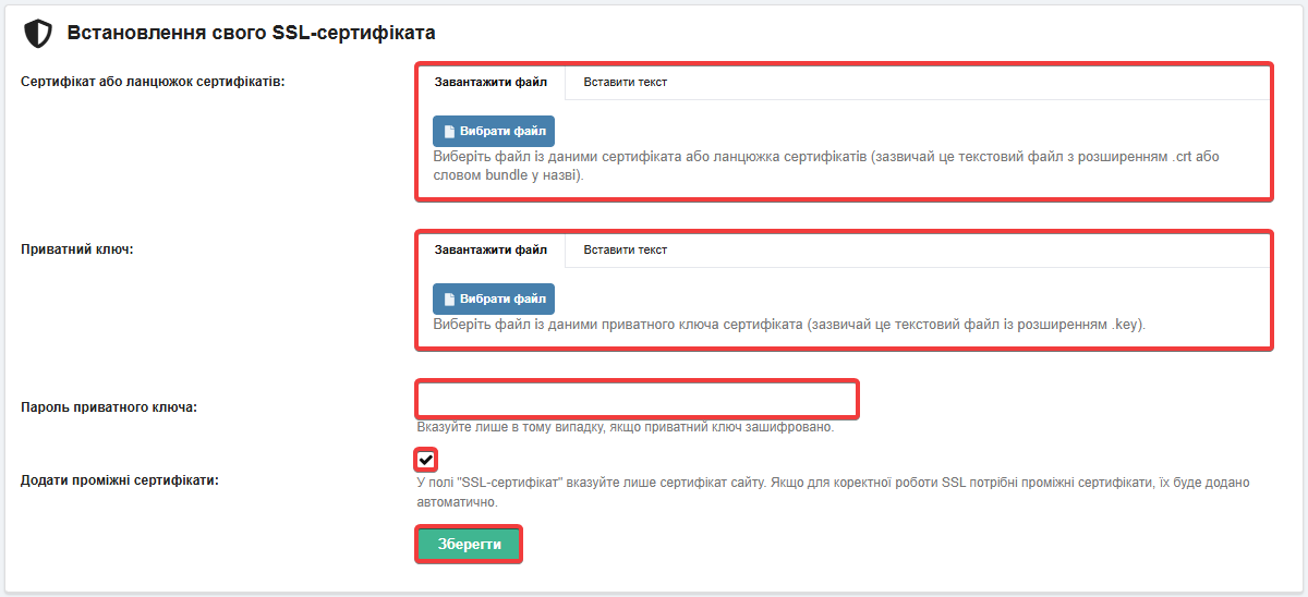 - «Додати проміжні сертифікати» — увімкніть, якщо файл сертифіката містить тільки дані сертифіката на домен і не містить даних усього ланцюжка сертифікатів.