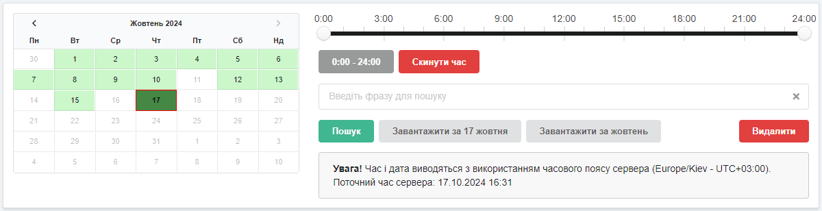 - «Завантажити за місяць» — завантажує лог за місяць, до якого належить вибраний у календарі день. ⚠️ Лог за поточний місяць містить усі дні з початку місяця, крім поточного.