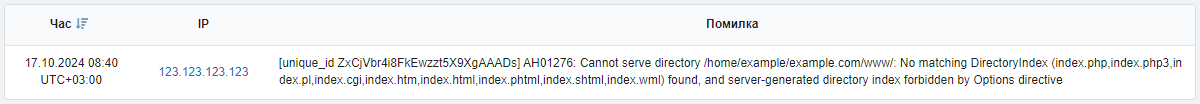 - Час у логу зберігається в часовому поясі, встановленому в налаштуваннях PHP (параметр
