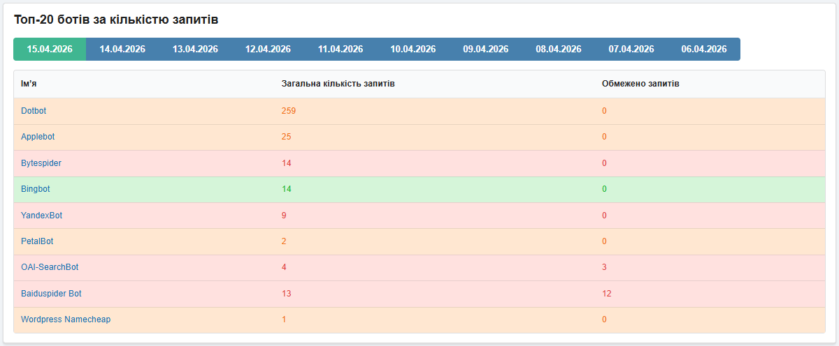 Статистика дозволяє швидко визначити, від яких ботів надходить найбільше запитів і для яких із них може знадобитися обмеження доступу.