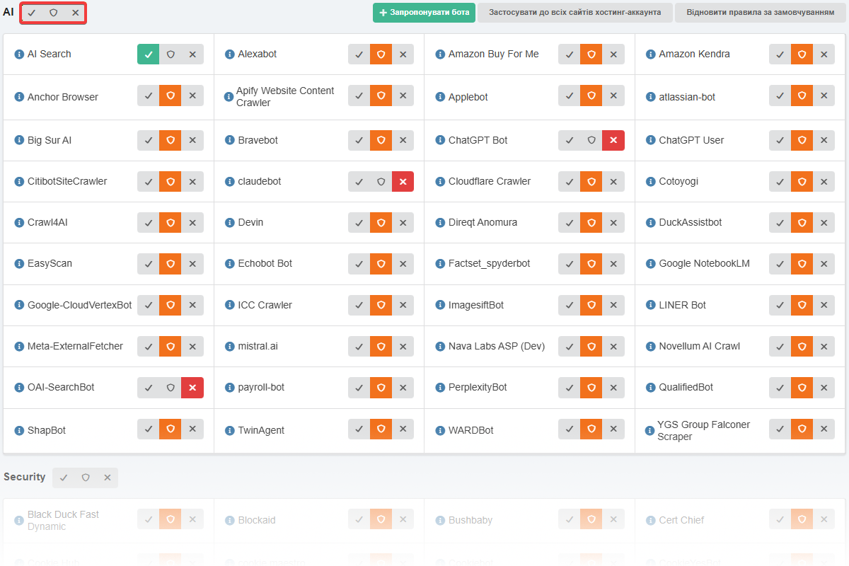 Доступ до сайту для ботів налаштовується в розділі «Захист сайту» на вкладці «Боти» за допомогою правил: