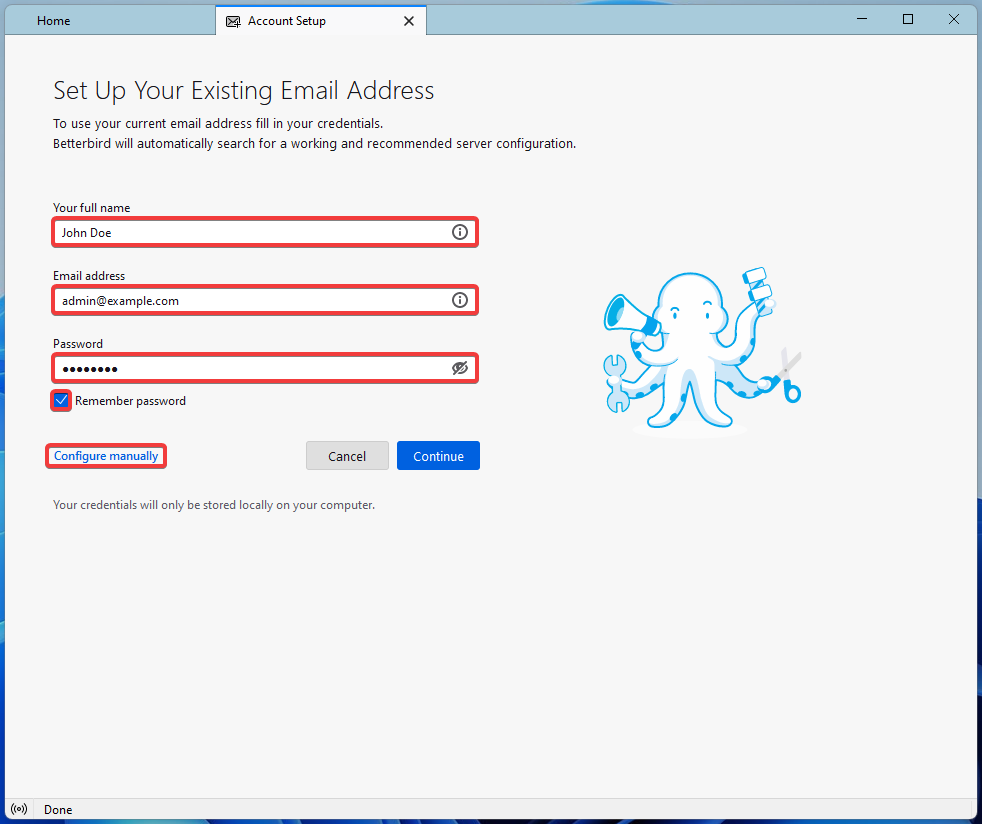 - Вкажіть ваше ім'я, назву та пароль поштової скриньки і натисніть «Configure manually»: