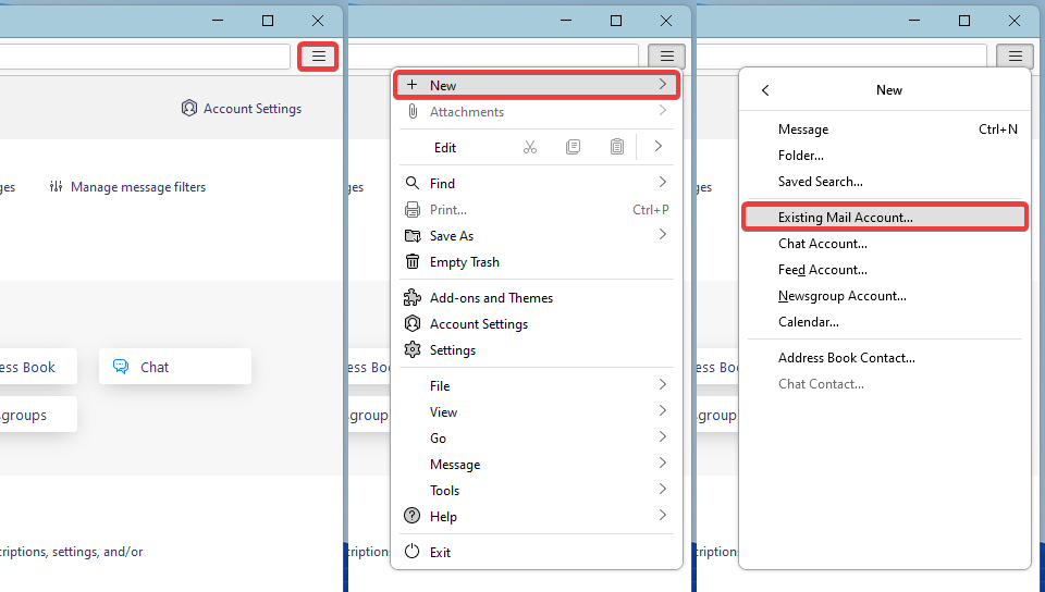 - В основному меню застосунку виберіть «New → Existing Mail Account»: