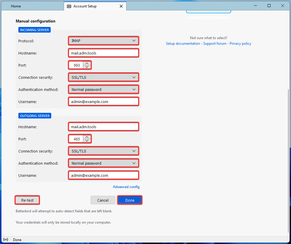 - Вкажіть налаштування підключення та натисніть «Re-test», а потім «Done»: