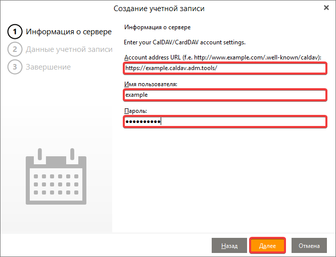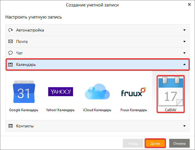 - Виберіть «Календар → CalDAV» і натисніть «Далі»: