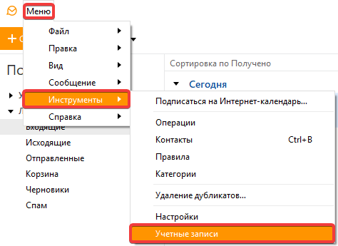- В основному меню застосунку виберіть «Меню → Інструменти → Облікові записи»:
