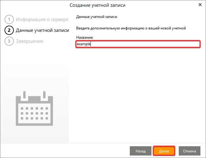 - Вкажіть довільне ім'я облікового запису, яке буде використовуватися для визначення календаря, і натисніть «Далі»: