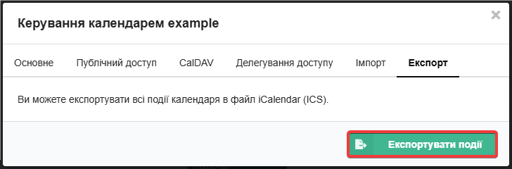 У розділі «Календар» відкрийте налаштування календаря, переключіться на вкладку «Експорт» і натисніть «Експортувати події»: