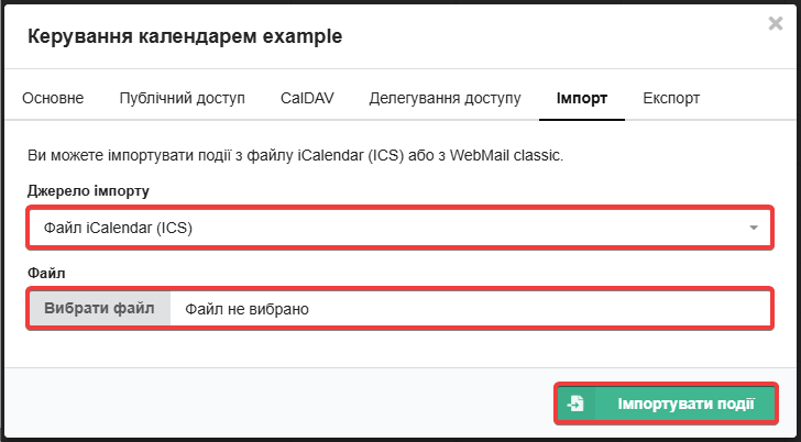 - Виберіть джерело імпорту (файл ICS або календар WebMail classic) і натисніть «Імпортувати події»: