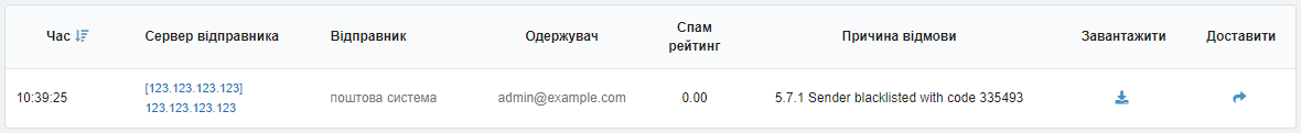 У логу відхилених листів виводиться інформація про листи, які були відправлені на ваші поштові скриньки, але з якихось причин були відхилені нашим поштовим сервером (наприклад, через наявність відправника в чорному списку або перевищення місця для пошти). Лог знаходиться в розділі «Відхилені листи».