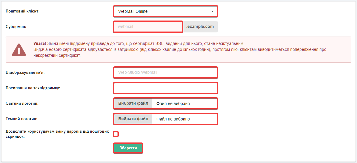 - «Дозволити користувачам зміну паролів від поштових скриньок» — виведення на сторінці входу у WebMail посилання, за яким користувач може змінити пароль поштової скриньки, якщо знає поточний пароль. При вимкненій опції змінити пароль можна буде тільки через налаштування поштової скриньки, а при спробі зміни пароля на сторінці зміни пароля буде виводитися помилка, що зміна пароля заблокована адміністратором.