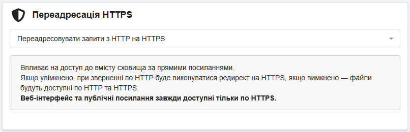 Керування переадресацією при зверненні до файлів у сховищі по HTTP — робити файли доступними як по HTTP, так і по HTTPS, або запити по HTTP переадресовувати на HTTPS.