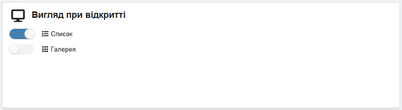 - Галерея — медіафайли відображаються у вигляді мініатюр, клік на медіафайл відкриває його перегляд у браузері або завантажує.