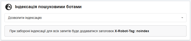 За замовчуванням індексація дозволена. При забороні індексації для всіх файлів, публічних посилань і сторінок сховища додається заголовок X-Robots-Tag: noindex.