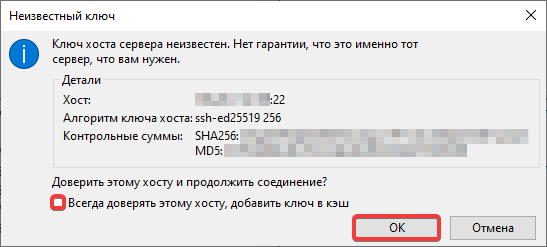 - Якщо висвітиться попередження про невідомий ключ, то ключ хоста сервера відсутній у кеші FileZilla (це характерно для першого підключення) або змінився (наприклад, через перенесення хостинг-акаунта на інший сервер). Щоб попередження не висвічувалося під час кожного підключення, увімкніть «Завжди довіряти цьому хосту, додати вказаний ключ у каше». Щоб підключитися, натисніть «ОК»: