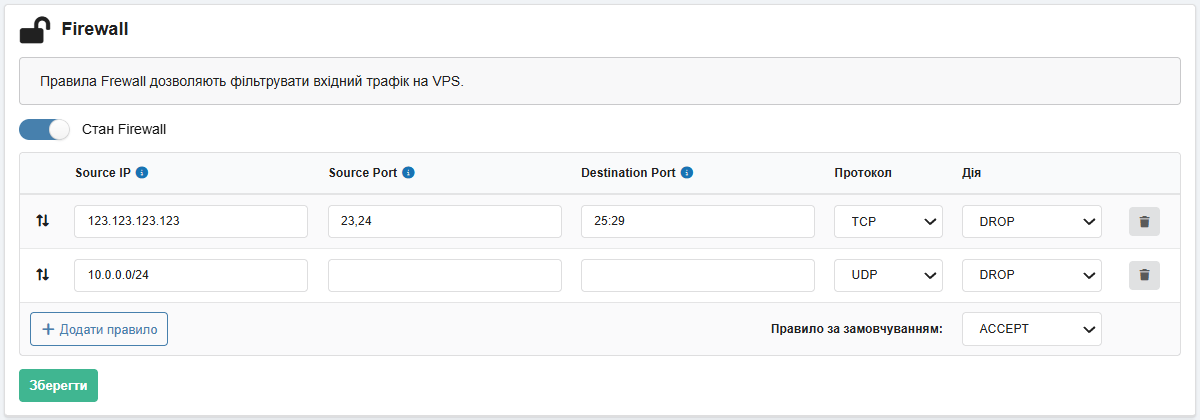 Правила Firewall застосовуються в iptables на KVM-сервері, де розміщується VPS, для вхідного трафіку, який йде на цей VPS. Це дозволяє відсікати шкідливий трафік до того, як він дійде до сервера.