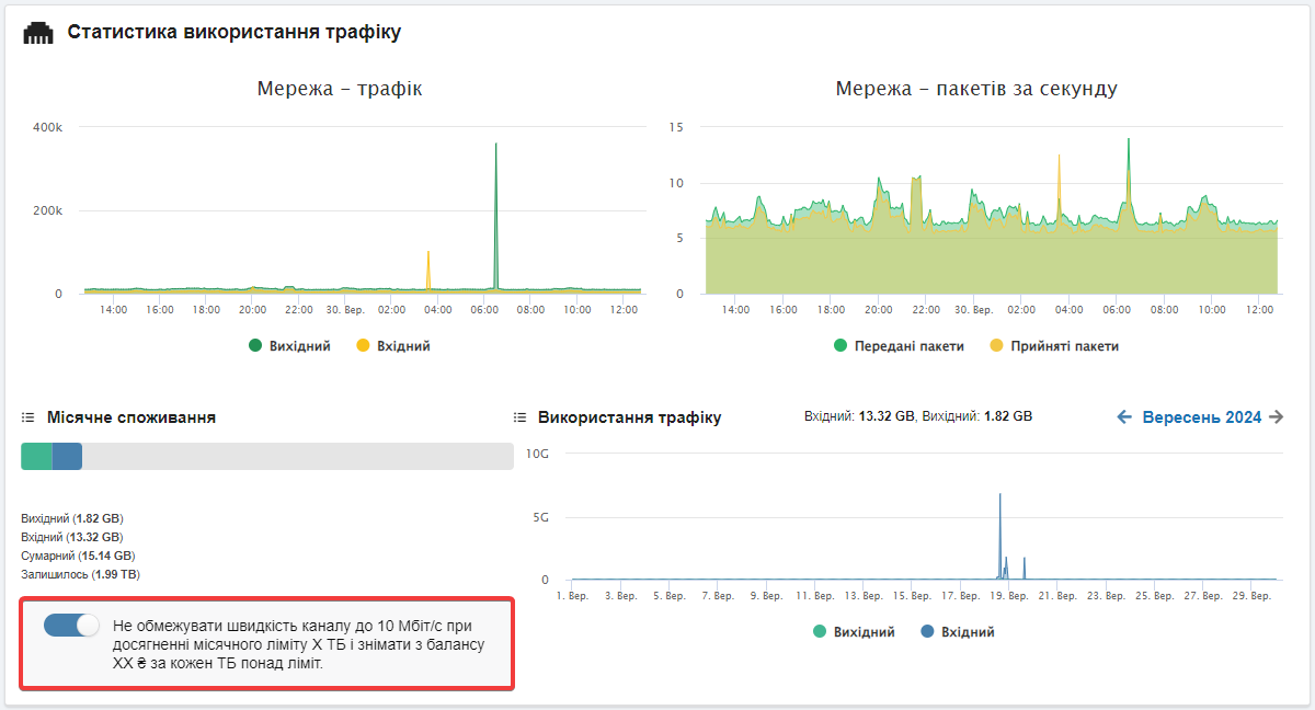 Після увімкнення для сервера відновлюється стандартна швидкість каналу і починає використовуватися платний трафік понад стандартний ліміт. Оплата списується з балансу за кожен 1 ТБ додаткового трафіку в найближчу ніч відразу після початку використання цього 1 ТБ.
